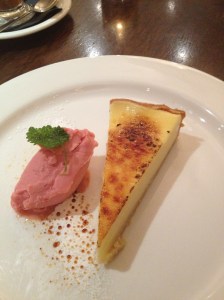 We went downstairs to the Jasmine Bar and each had a drink. It was my first Guinness of the trip. I had expected a taste difference in the Guinness, as everyone always talked about, but I didn’t taste one (there will be more on this in a later post). Michelle and I then decided that we were hungry but not very hungry (lunch was quite large and filling) so we just ordered some dessert and Irish coffee. We opted for the homemade lemon tart with homemade raspberry sorbet. It was wonderful!: